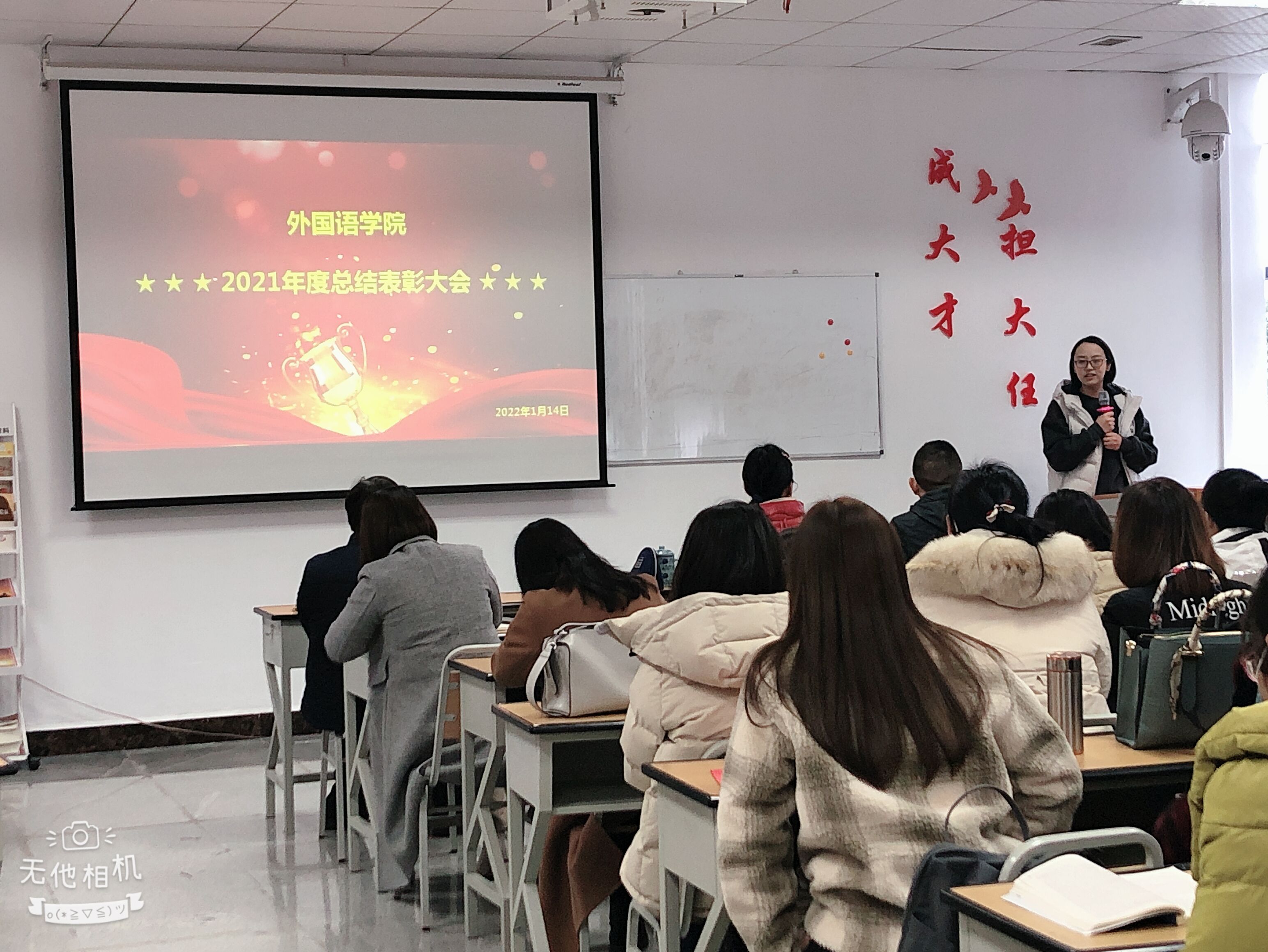 最后院长王梅围绕学科教学、学科与科学研究、师资队伍建设、学生服务管理以及存在的问题五个方面,就学院2021年度高质量发展情况做了总结发言,并为学院2022年的发展指明了前行路径。会议尾声,院长王梅鼓励受表彰的集体、个人在新的一年里立足新起点、再创新辉煌,同时希望全院教职工向优秀学习、向先进看齐,当好主人翁,凝心聚力,共同参与学院共建,促使学院各项工作再上一个新台阶。总结表彰大会在大家热烈的掌声中落下帷幕。