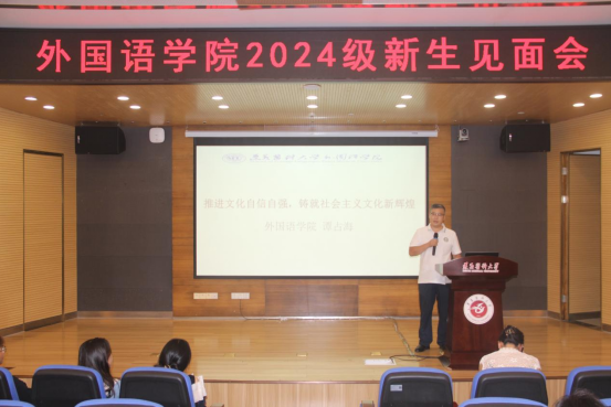 谭占海为同学们作了思想政治教育,他结合学院的办学理念、校规校训,鼓励同学们勤学善思笃行,提升综合能力,为社会做出贡献。他希望同学们能够将外语同中国文化结合起来,讲好中国故事,弘扬中国文化,推进文化自信自强,成为担当复兴大任的时代新人,铸就社会主义文化新辉煌。