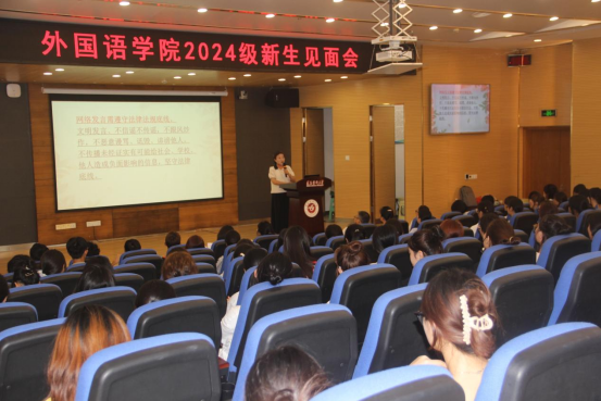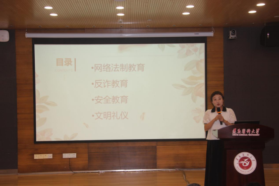 唐茜分别从网络法制教育、反诈防诈教育、安全警示教育和文明礼仪方面进行入学教育。网络不是法外之地,她叮嘱同学们谨言慎行,不信谣、不传谣、不跟风,文明上网;提高警惕,从正规渠道购买商品,不外借电话卡、银行卡。她强调,同学们一定要保障自己的安全,文明出行,防毒拒毒,不在寝室内使用违禁电器。