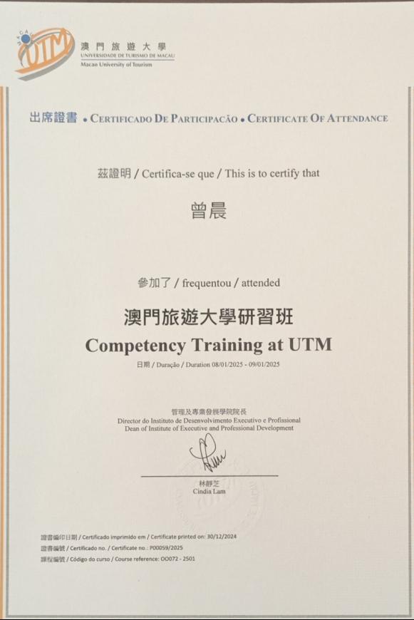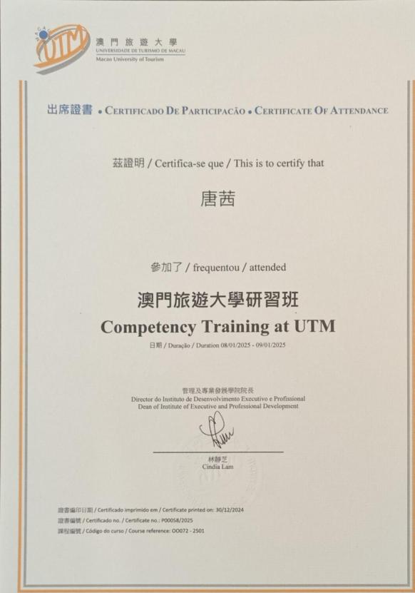 在为期五天的活动中,行程紧凑且内容丰富。通过专题培训、酒店现场实地培训、现场交流等方式,了解到了珠澳旅游、酒店业先进的管理服务理念,围绕珠澳两地酒店管理、教师教育协同育人、如何促进高校毕业生高质量就业等进行了探讨交流,直观感受行业运营模式、岗位需求、工资待遇及就业渠道等,为英语专业毕业生开拓了新的就业领域。