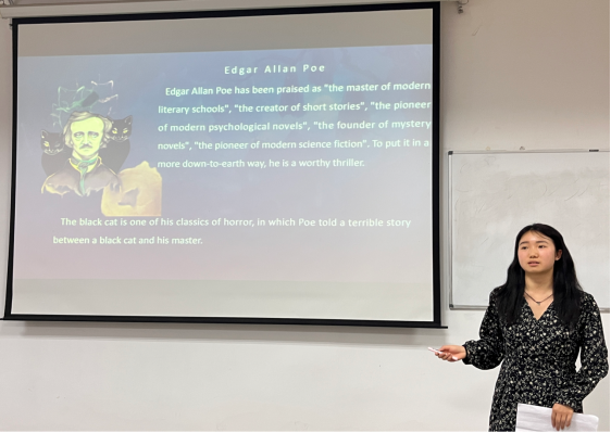 分享会开始,同学们陆续就位,热情澎湃。来自2021级的四名同学为我们介绍《黑猫》、《献给艾米丽的玫瑰》《大麻烦》两部小说。分享者讲解时完全沉浸其中,大家也听得津津有味,其间伴随着轻音乐的播放,现场氛围良好。讲解过程不仅有哲学性的话语,也有通俗易懂的小故事。分享者带大家走入一个个触动人心的故事之中,以精彩的表达方式给大家带来欢声笑语和轻松愉悦,让大家感受到勇敢无畏的人生和浪漫治愈的爱情。随后,分享会进入提问环节,观众对分享人提出了自己的问题,分享者就观众提问一一耐心回答,评委老师作出公正客观的评价。提问环节气氛活跃有趣,拉近了观众与选手的距离。同时,本次分享会展播了有趣的视频,激发了同学们读书的兴趣。