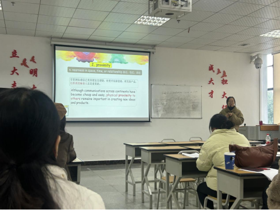 随后,基础英语教研室的陆少辉老师也聚焦大学英语,重点关注第二册书中Unit 5单词的讲授。陆老师利用视频,引入中国古时的四大发明和如今的新四大发明,将全球化与全球本土化这两个概念进行对比,带领学生理解较为抽象且复杂的全球本土化这一概念。在基础概念理解完成后,陆老师还充分利用AI生成视频的手段,带领学生快速进入单词的学习,将学生视为课堂的主体,在单词讲授中穿插与本省省情、本国国情以及四六级考点相关的知识,将知识学习与思政教学充分结合,教学重难点清晰。
