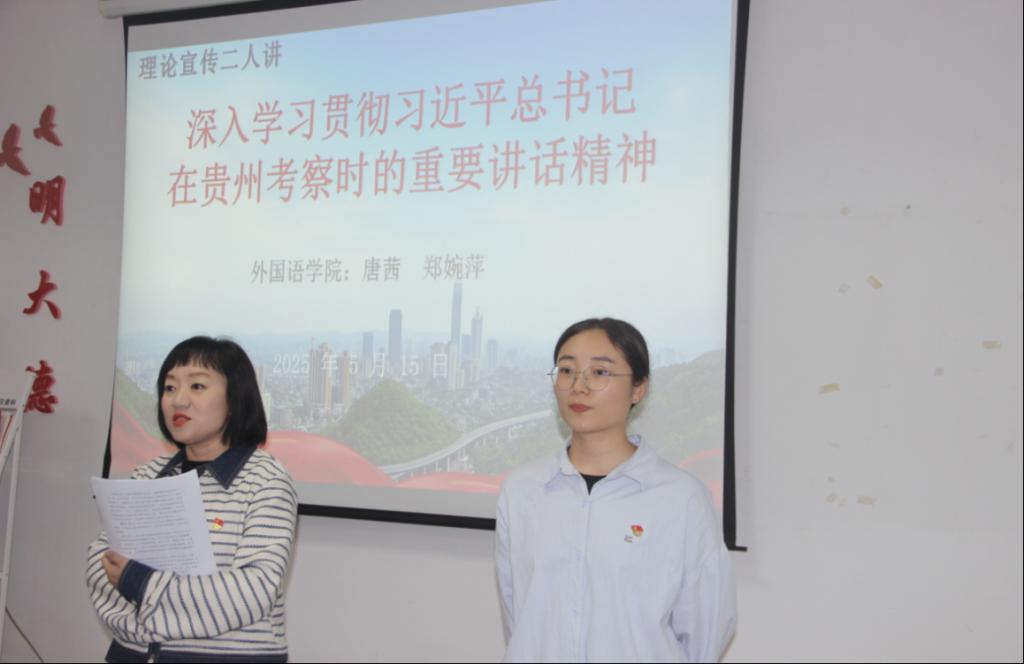 本次“理论宣传二人讲”活动,以生动的形式、丰富的内容,让同学们对习近平总书记在贵州考察时的重要讲话精神有了更全面、更深入的理解。通过理论与实践的结合,进一步激发了大家学习与奋斗的热情,增强了责任感和使命感。