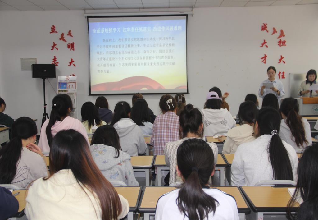 郑婉萍从习近平总书记在贵州考察重要讲话的背景和意义入手,详细阐述了讲话中的“两个特点”和“七个深刻领会把握”,深刻阐释了习近平总书记重要讲话的精神实质和丰富内涵。唐茜结合实践案例,从高质量发展、发展和生态、民生、党的建设等方面进行了系统的阐述和解读,并针对英语专业的学生未来发展和就业前景等进行了详细分析与指导。最后,唐茜带领全体同学一起学习了习近平总书记给谢依特小学戍边支教西部计划志愿者服务队队员回信,深刻领会习近平总书记对青年“听党话、跟党走”的嘱托,号召同学们“到祖国最需要的地方去”,为强国建设凝聚青春力量。