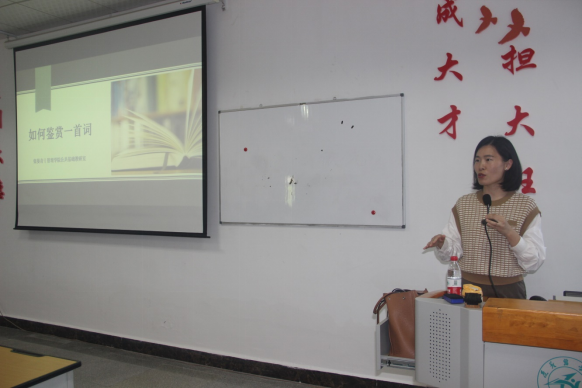 张晏青围绕如何鉴赏一首词这一主题为大家进行详细讲解,以现代电影《满江红》与现代歌曲《乌梅子酱》为切入点,展开讲述了诗词各阶段的变化。还带领同学们深入鉴赏了《长干行》、《花间集》、《普萨蛮》等诗词,并将词的起源与流变,类型与发展等,进行了深入浅出地讲解。张晏青作简短总结,希望同学们能通过学习诗词提高个人语言文字水平,提升个人修养,通过诗词养身、养性、养心。