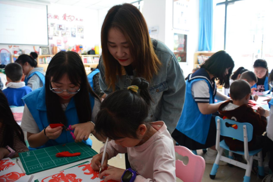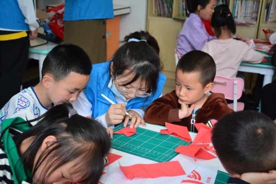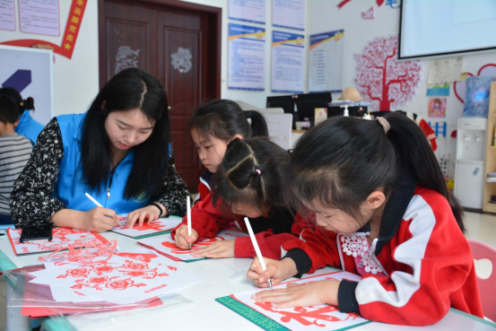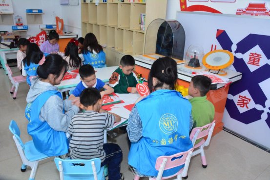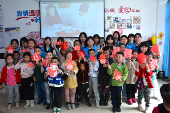 志愿者们到达活动地点后举办了一个小型见面会,简单地介绍了活动来意,刘福娟为本次活动进行简短致辞。见面会结束,志愿者们开始和小朋友们进行初步交流。在小朋友们好奇的眼光之下,志愿者们将剪纸工具分发,一起进行剪纸活动,锻炼了小朋友们的手眼协调能力。随后活动进入英文唱歌环节,“ Twinkle, twinkle, little star,how I wonder what you are…”,一阵阵清脆的歌声传来,如展翅欲飞的蝴蝶,扑闪着灵动的翅膀,现场气氛既欢快又活跃。各种各样的零食让小朋友们激动不已,脸上满是天真烂漫,洋溢着生机、活力和希望,感染了在场的每一位志愿者。活动最后,一张张合影将快乐保存,小朋友依依不舍地和志愿者们告别,期待着下一次的相遇。