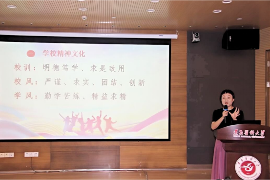 唐茜从学校精神文化、校徽、院徽、意识形态、法制教育、学生意见反馈渠道等五个方面为同学们展开讲解。以校训“明德笃学,求是致用”为切入点,唐茜为同学们讲解了校规校纪,普及了网络法制教育,叮嘱同学们要遵守规则,严于律己。她强调,大学生网络发声要理性表达,不要干扰破坏网络正常传播秩序。大学生要理性看待网上舆论,理性判断,切勿罔顾事实,在网上发表主观臆测的言论。身为“网生代”的大学生,在自媒体上的发言要正能量,需要表达的意见可以采用合适的意见反馈渠道。