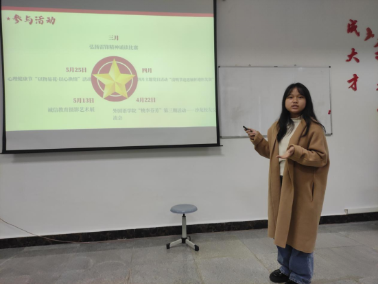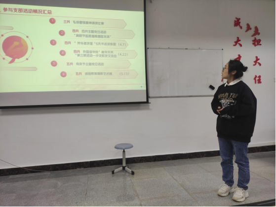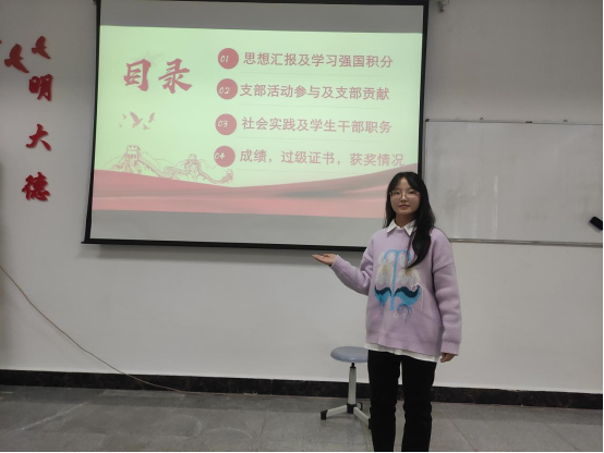 入党积极分子的考察汇报由支委会、普通党员联合给分,采用自评、他评相结合。入党积极分子围绕思想汇报、“学习强国”学习、支部贡献度、社会实践与公益服务、学生干部履职、学业成绩等方面进行汇报。汇报结束,杨芳针对ppt制作、汇报技巧进行了点评,还叮嘱了后半年考察的注意事项。