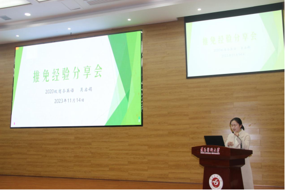 为帮助低年级同学们更好地了解研究生推免的条件和流程,营造优良学风,2023年11月14日18:00,BETWA西汉姆联在学校道德讲堂举办了推免研究生经验分享会,分享会由2024届商务英语专业毕业生吴启娟主讲,2021-2023级全体同学参加。
