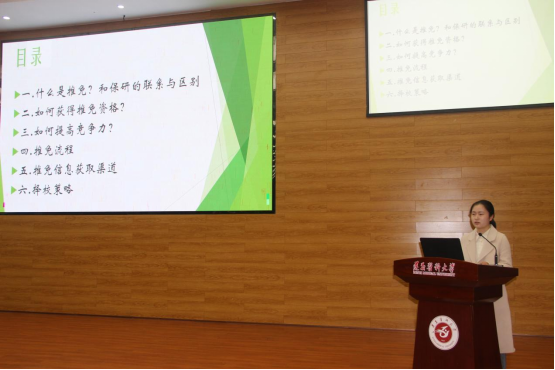吴启娟是学院2024届推免研究生,目前预录取四川外国语大学。她从自身推免经验出发,围绕推免和保研的联系与区别、如何获得推免资格、如何提高竞争力、推免研究生流程、推免信息获取渠道、择校策略六个方面进行分享。她着重介绍了获取推免资格的条件、加分要求,鼓励同学们敢于冲刺985、211院校;推免不是一个瞬间,而是从一年级就要开始筹备。此外,吴启娟还向同学们分享了一些面试过程中的技巧,希望下一届的同学们能吸收经验,在保研的过程中少走弯路。互动环节,同学们踊跃提问,吴启娟耐心答疑解惑,让大家收获满满。