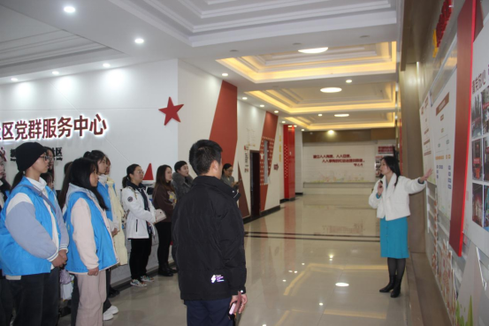 刘福娟带领青年学生们一起学习宣传贯彻习近平总书记重要讲话精神——《动员引领广大团员在强国建设、民族复兴伟业中挺膺担当的决定》,加强学生们的思想教育,她表示大学生社区实践活动是引导学生走出校门、走向社会、培养锻炼才干的好渠道。红星社区党总支部副书记李易易也与同学们分享了自己毕业通过西部计划进入社区工作的经历,鼓励青年学子参与到社区工作中来。活动现场,讲解员从“星引擎”激活原动力,建强基层组织、“星讲堂”凝聚正能量,铸牢政治忠诚、“星舞台”弘扬新风尚,营造温馨家园、“星治理”奏响和弦曲,提升管理效能、“星服务”构筑连心桥,共享美好生活等五个方面为学生们介绍了红星社区。作为团中央基层组织改革示范点,他们始终坚持党对城市社区工作的全面领导,同时,在讲解员的带领下,同学们参观了该社区党群服务中心的舞蹈练习室、书法练习室、文化长廊等特色功能区。活动结束,同学们纷纷表示,将积极响应时代号召,学好专业知识,积极投身志愿服务,展现新时代青年风采,在基层绽放绚烂青春之花。