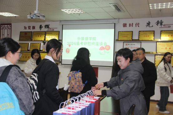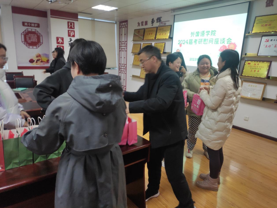 座谈会上,老师们对同学们坚持学习、克服困难、为梦想而不懈奋斗的精神表示充分肯定和高度赞赏,向备考学生表达了慰问,鼓励学生继续坚持、奋勇向前。谭占海与考研学生亲切交流,他叮嘱同学们,一是要保持良好的学习状态,按照既定的安排合理备考,不骄不躁,持续发力,做好最后一公里;二是要劳逸结合,不必刻意加码,保持身心健康,以最好的状态备战考试。王梅提醒同学们注重劳逸结合,提高学习效率,掌握复习技巧和方法,并表示学院将尽全力为大家的考研保驾护航。唐茜鼓励同学们只争朝夕,不负韶华,保持良好心态,注意饮食营养,保持身体健康。会后,学院领导为每一位考研学生分发考研“加油包”,为学生们送上学院的温暖,表达了殷切期望。
