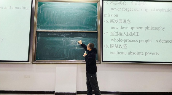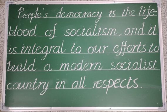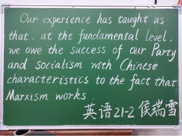 成功的教学离不开出色的板书,一手美观、正确、规范的板书能激发学习热情。训练营对字体笔法、板书结构、板书内容、板书逻辑、书写速度等方面都有严格要求。第一堂课讲授了26个英文字母的书写;第二堂课是训练单词书写,专门挑选了社会主义核心价值观24个英文单词、党的二十大热词英文词组作为训练内容;第三堂课是练习党的二十大金句英文段落。课堂训练时,好学的同学们总是虚心向老师提问请教,大家进步明显,锤炼才得以蜕变。课后,学生助理会收集意见反馈,及时掌握训练的实际情况,根据学生们的吸收情况调整授课内容和方式。为检验同学们的学习成果,学生党支部还组织了“粉笔凝实力 书写展精神”的英文粉笔字板书比赛。