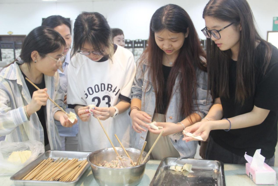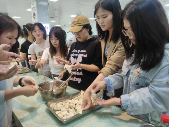 巧手包馄饨,劳动最光荣。钱民章说,劳动是生活的基石,是创造幸福的源泉,更是我们每个人实现价值的重要途径。她鼓励同学们,在劳动中获得幸福,在幸福中坚持劳动。“先把馄饨皮摊在手掌,用勺子装一些肉馅放在中间,注意不要放太多,再沿着两个角对折变成三角形,最后一步沾点水用手捏紧馄饨皮就可以了。”她还教同学们怎么包馄饨。从和馅、拿皮到包馅、烹煮,大家有说有笑,相互切磋包馄饨技巧,活动现场热闹非凡。不一会儿,盘子上就摆满了各式各样的馄饨,每一步都凝聚着大家的辛勤劳动和汗水。在热火朝天的忙碌氛围中,大家深入理解了正确的劳动观念,弘扬了劳动精神,自觉培养劳动意识和劳动能力。唐茜提醒同学们,大家要在活动中提升自己的动手能力和劳动技巧,以此来培养自强自立的品格,切实做到德智体美劳全面发展。