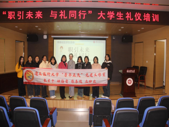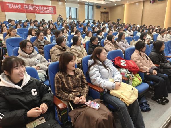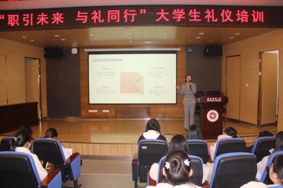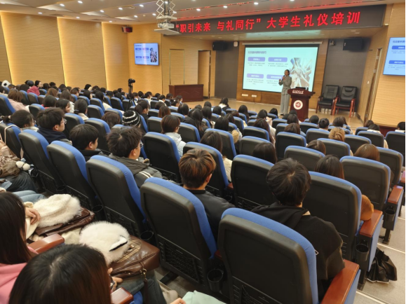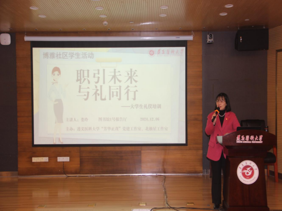 为了提升同学们的形象气质,加强大学生德育教育,助力提高学生就业竞争力,2024年12月7日15:50,“芳华正茂”党建工作室联合北极星工作室在图书馆1号报告厅举办了“职引未来 与礼同行” 大学生礼仪培训。培训由BETWA西汉姆联学生党支部书记、“芳华正茂”党建工作室主持人杨芳主持,遵义市高级礼仪培训师娄玲主讲,博雅社区英语专业约150名学生参加。