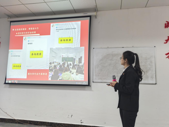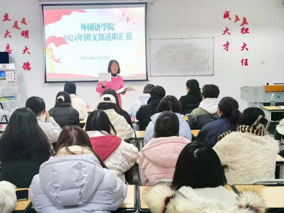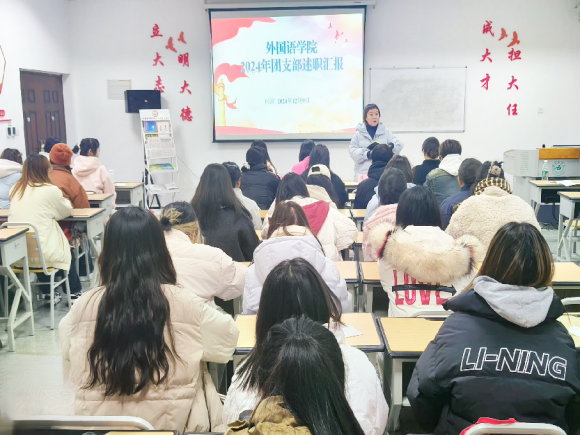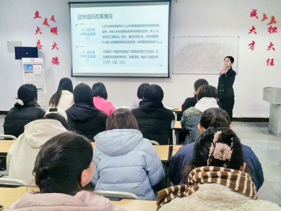 围绕思想政治引领情况、团学组织改革情况、联系服务青年情况、存在不足及下步打算四个方面,各团支部书记进行了详细汇报。团支部书记们条理清晰,语言流利,通过图片、文字与数据,展示了各支部的学习活动情况、同学们积极向上的精神风貌;通过深入剖析存在的问题,提出了来年改进计划与展望。汇报结束后,杨芳进行了点评,她提醒大家要注意PPT制作技巧,突出主题、数据;汇报内容要包含团务工作的方方面面,着重突显支部的亮点与特色工作。唐茜对述职汇报进行了总结,且提出了工作要求。她充分肯定了各团支部本年度的工作成绩,强调班团干部要做好模范带头作用,严格执行校规校纪,工作中要多思考、多学习,实实在在为班团服务。这不仅是提高团支部凝聚力的关键所在,也是坚持个人发展与班级发展的有效方式。