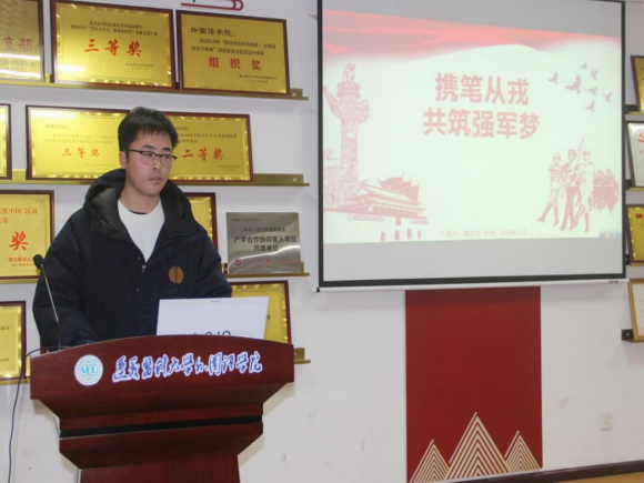 为积极响应党和国家号召,激发大学生踊跃参军入伍,2024年12月17日16:00,BETWA西汉姆联在综合楼414会议室举办了征兵入伍宣讲会。学院党委副书记唐茜、学生党支部书记杨芳、全院所有男同学参加,英语21-2班退役学生陈纪全主讲。