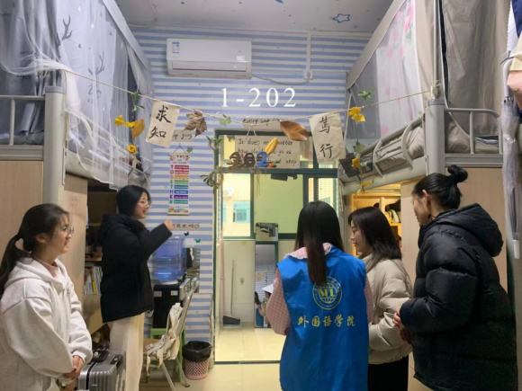 活动筹备阶段便收获同学们的热烈响应,各寝室成员群策群力、发挥创意,将寝室打造成兼具个性与内涵的专属空间。18日,党委副书记、专职辅导员、教师兼职班主任与学生会干部走进每间寝室,既感受到同学们用心营造的温馨氛围,也细致核查了卫生状况与用电安全。有的寝室贴满室友的学习生活照片与各类获奖证书、过级证书,定格成长瞬间、彰显奋进风采;有的精心设置阅读角,整齐摆放中外名著,书桌张贴励志话语与个人学习计划,让学习氛围浸润日常;还有的围绕二十届四中全会精神、“十四五”成就等时代主题布置手写双语金句,将家国情怀融入生活场景,展现当代青年的责任担当。多数寝室干净整洁、秩序井然,但个别寝室存在未使用电器仍插电、乱拉电线等安全隐患,带队老师当即提醒并指导同学们现场整改,筑牢校园安全防线。经过公平公正的评选,活动最终决出一等奖1名、二等奖2名、三等奖3名及优秀奖4名。